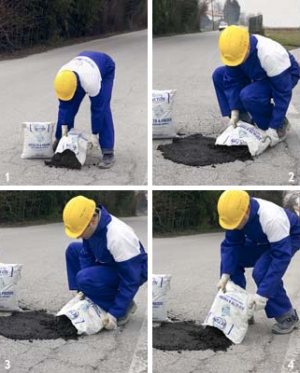 Campi d'impiego:Il conglomerato bituminoso a freddo è indicato per la manutenzione e riparazione di superfici stradali con traffico veicolare continuo (chiusura di buche, rappezzi, chiusura di scavi). É sconsigliato l’uso in parcheggi, aree condominiali, aree private, ingressi di abitazioni con traffico di mezzi scarso o nullo.